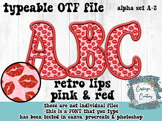 Retro Lips (Black&Red/Pink&Red) 2 full alpha set styles - ALPHA FONT A-Z - FAUX EMBROIDERY - TYPEABLE OTF FONT - Digital download