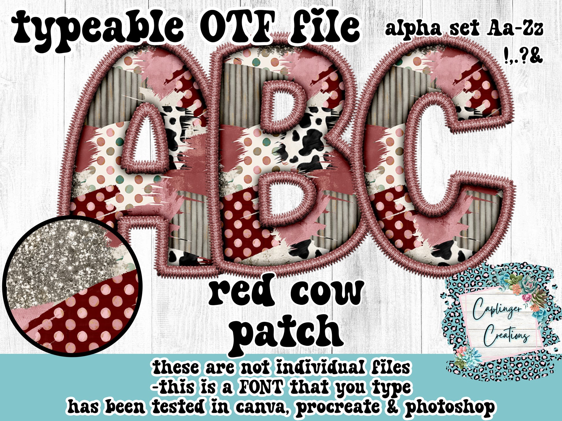 Cow Patches (Red thread) - ALPHA FONT A-Z - FAUX EMBROIDERY - TYPEABLE OTF FONT - Digital download